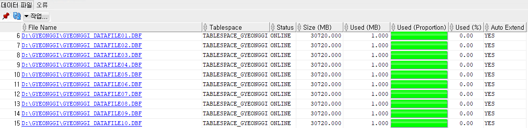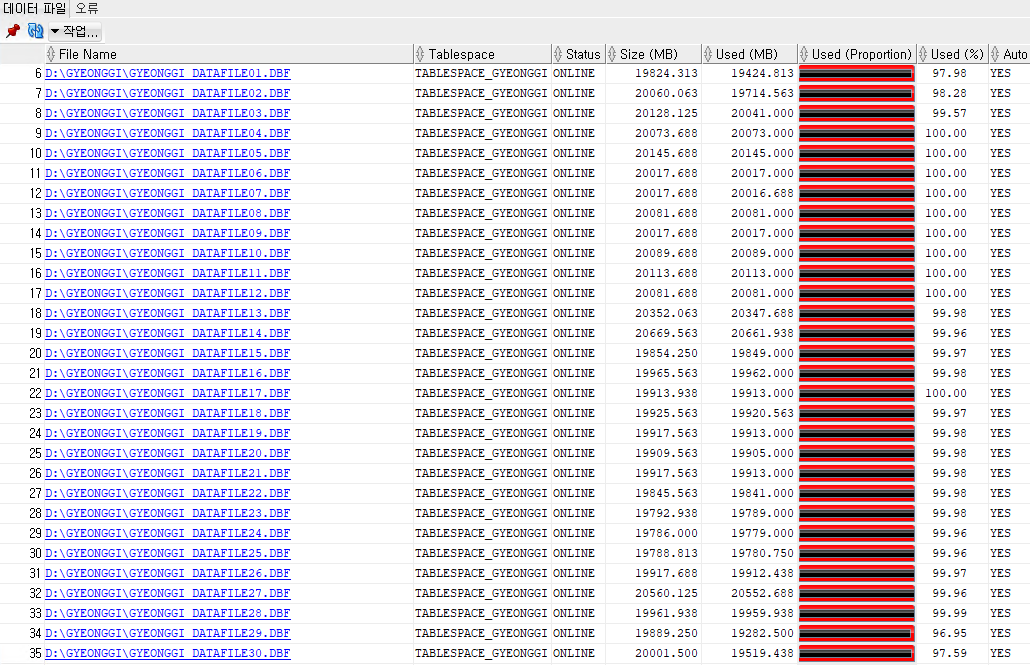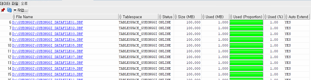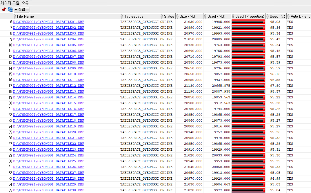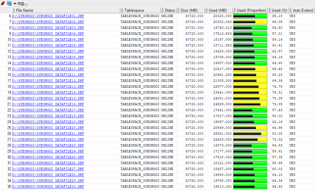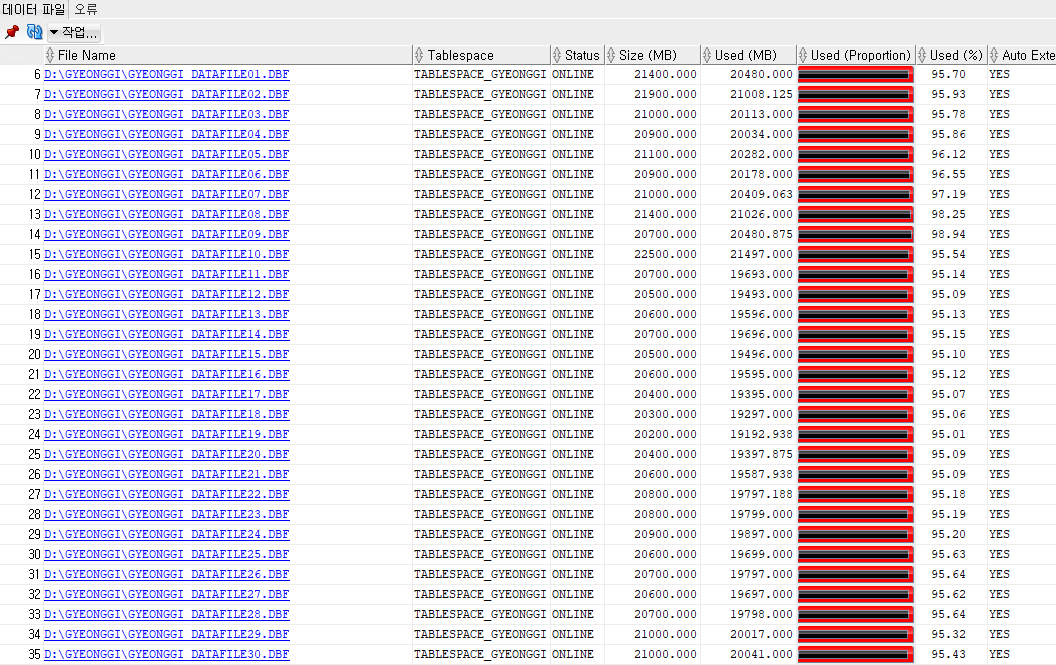 지금까지는 테이블스페이스 공간을 미리 만들어두고 시작했다. 덤프파일을 import했을때 예상 오라클 용량이 900GB라고 한다면, 30GB정도의 데이터파일 30개정도를 미리 만들어 두고 시작하는 형태였다.