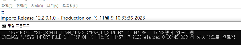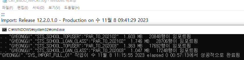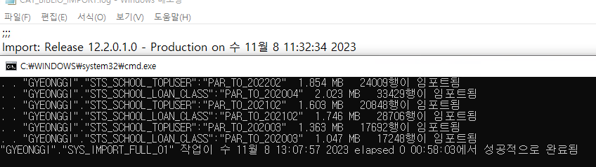 디스크 공간을 확보하는 데에는 약 33분이 걸렸고, import시간은 1시간 23분이 소요되었다.