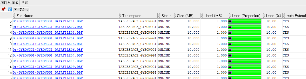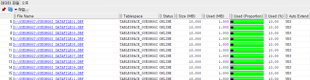 기본용량을 10MB로 잡아두고 10MB씩 AUTOEXTEND하도록 설정했다.