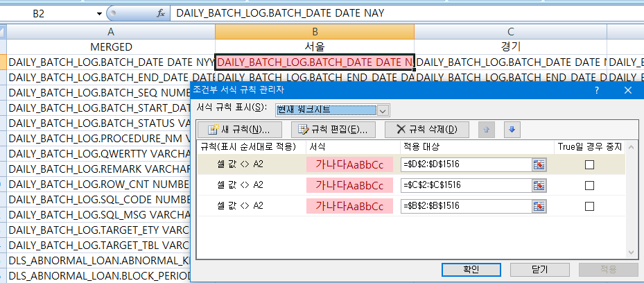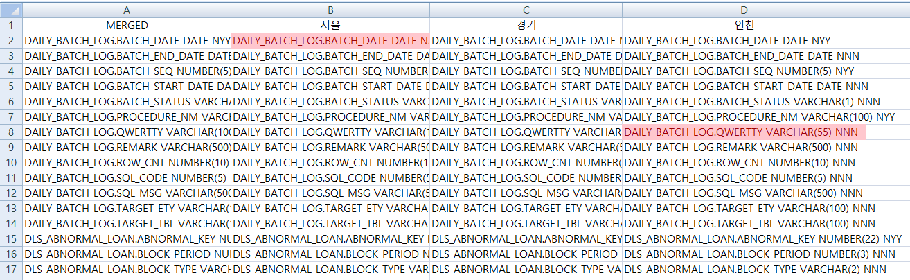 동일한 sql의 실행결과를 열 단위로 붙여넣고, 엑셀의 조건부 서식을 지정하여 A열을 기준으로 A열과 B열, A열과 C열, A열과 D열… 이런 식으로 비교를 하면 WinMerge에서 비교해주는 것과 유사하게 더 여러개의 DB 스키마를 비교할 수 있다.